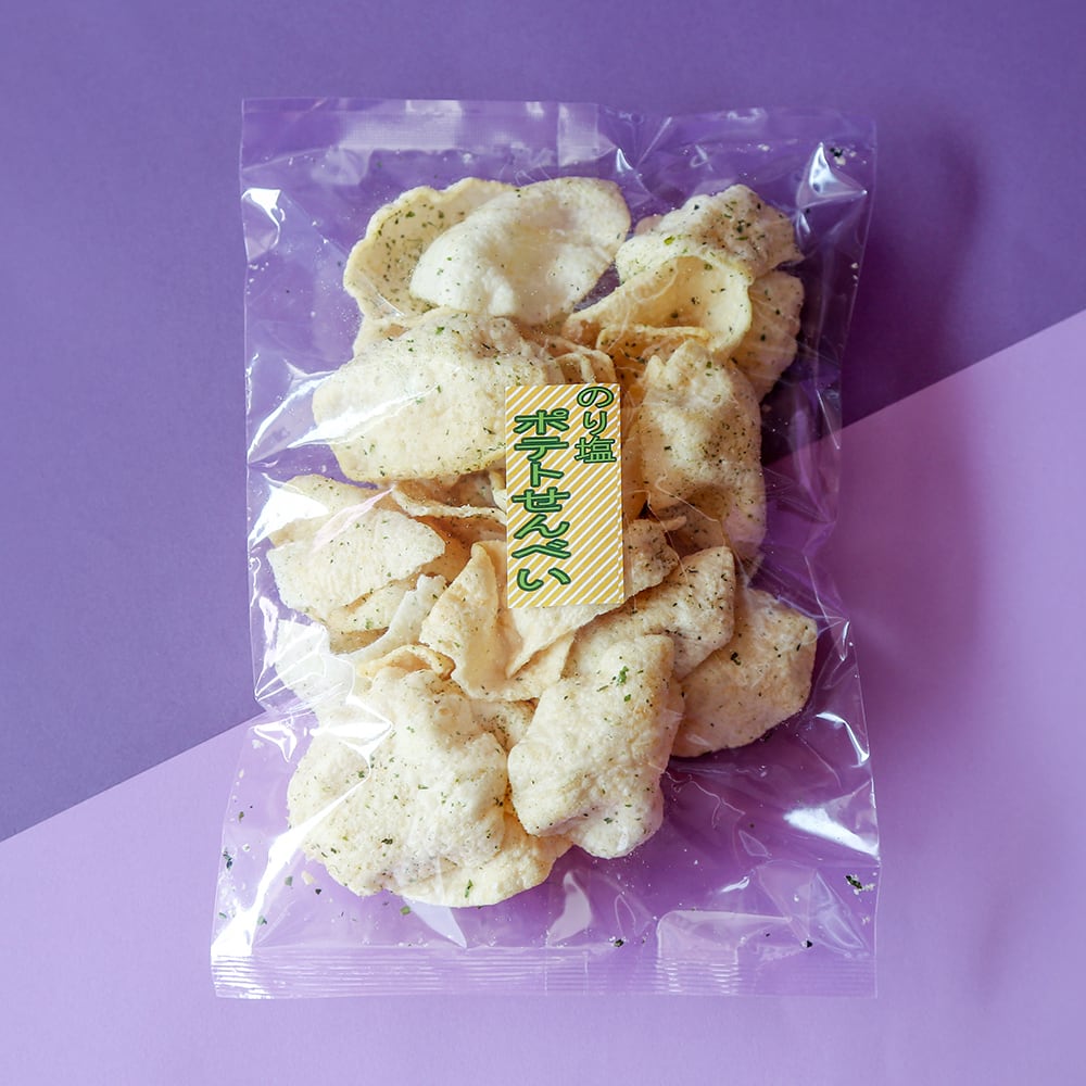 お米の甘みとジャガイモの旨みを閉じ込めた生地。「のり塩」揚げせんです。