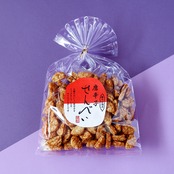 始めは、白コショウの刺激。あと味は、七味唐辛子の旨辛。まん中は、甘みの醤油だれ。絶妙な小粒の揚げせんべいです。