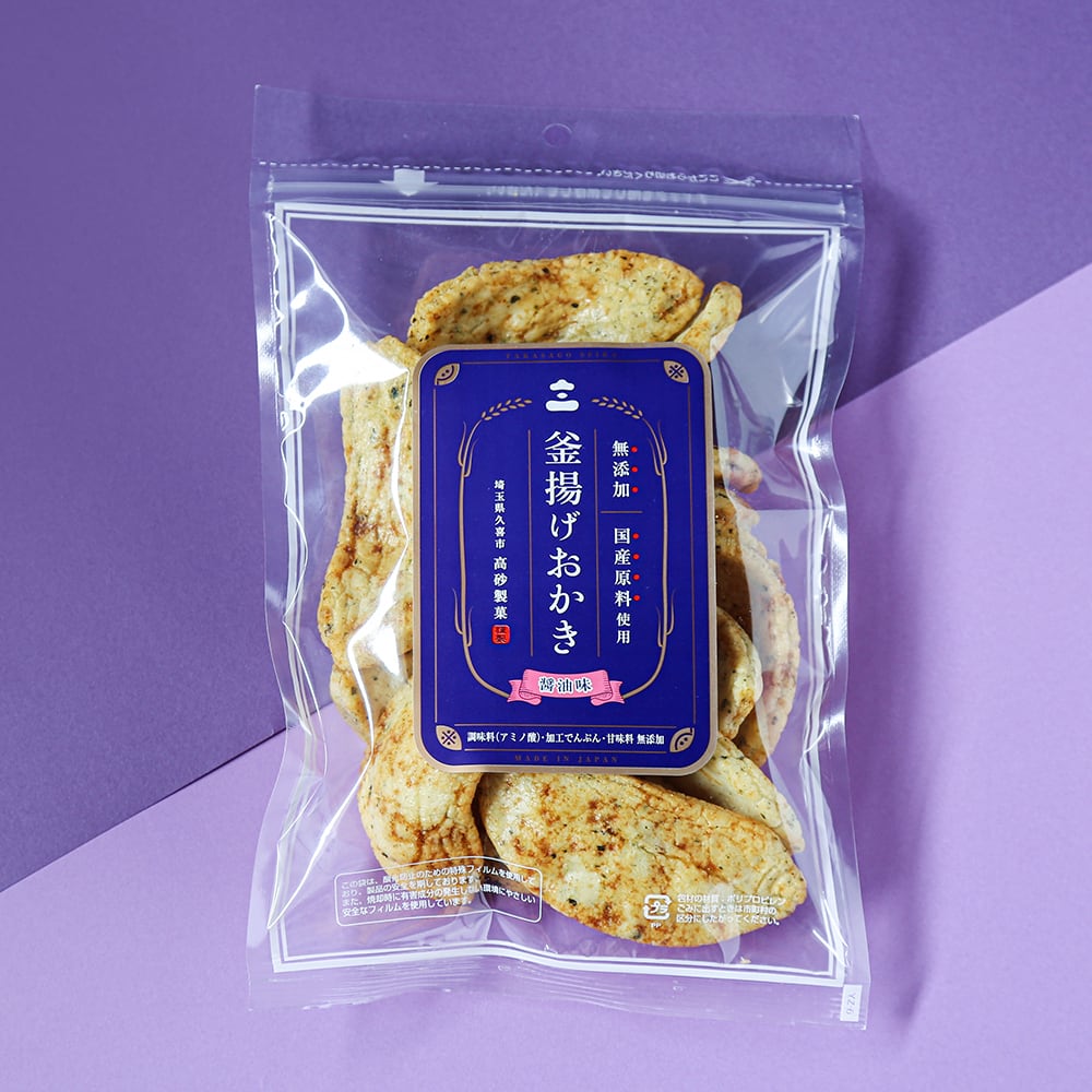 北海道産の大豆と小麦から作った一番搾りの醤油を使用。窒素分(旨み成分)が多く、香りが良いことが特長です。市販されている醤油のほとんどは大豆小麦ともに海外産原料ですが、髙砂製菓では国産にこだわり、原料のひとつ「アルコール」(日持ちさせるために使う)も添加していません。