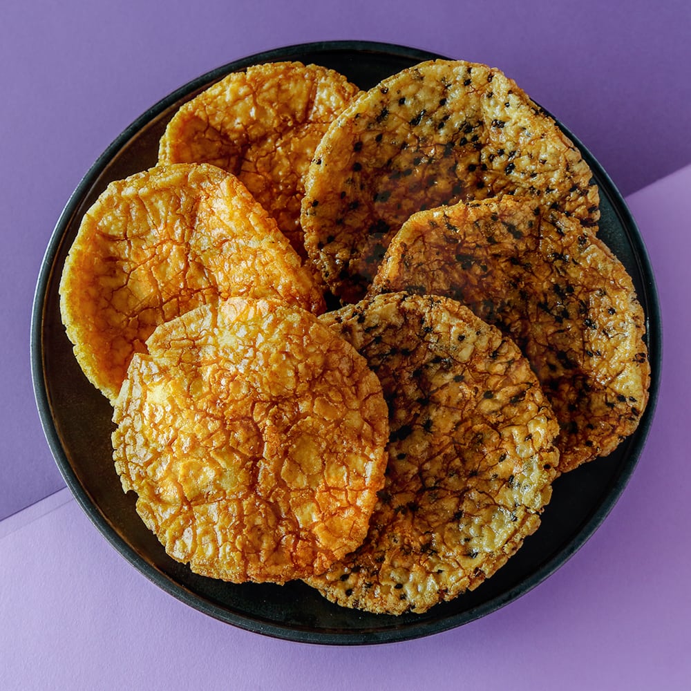 うるち米(国産)、こめ油(国産こめぬか)、カマンベールチーズパウダー、黒胡椒、粗糖(種子島産サトウキビ)、藻塩(瀬戸内海水)、粉末醤油、プロセスチーズパウダー、チーズフード/調味料(核酸)、乳化剤、香料、カロチノイド色素、(一部に乳成分・小麦・大豆を含む)