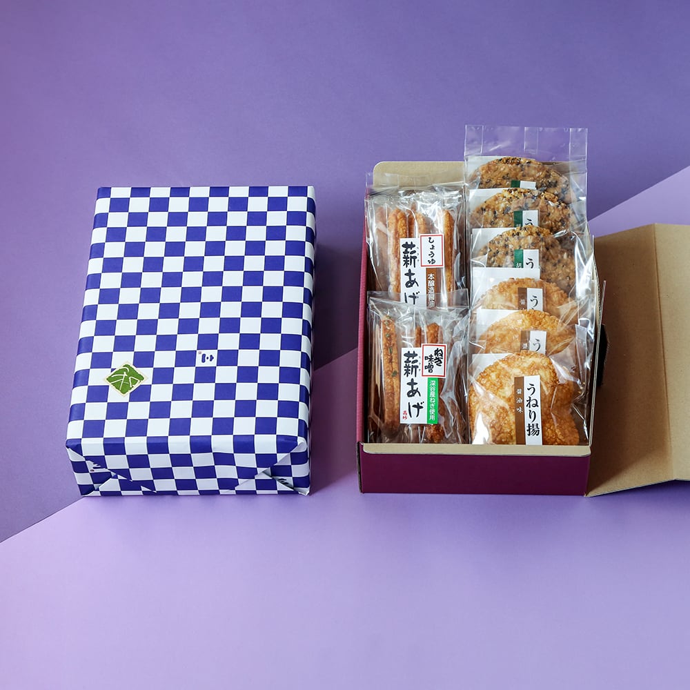 高砂製菓看板商品の「薪あげ(2種)」と直径約12 cmほどの食べ応えのある大きい揚げせんべいを詰め合わせた、贈り物や手土産にぴったりなギフトセットです。